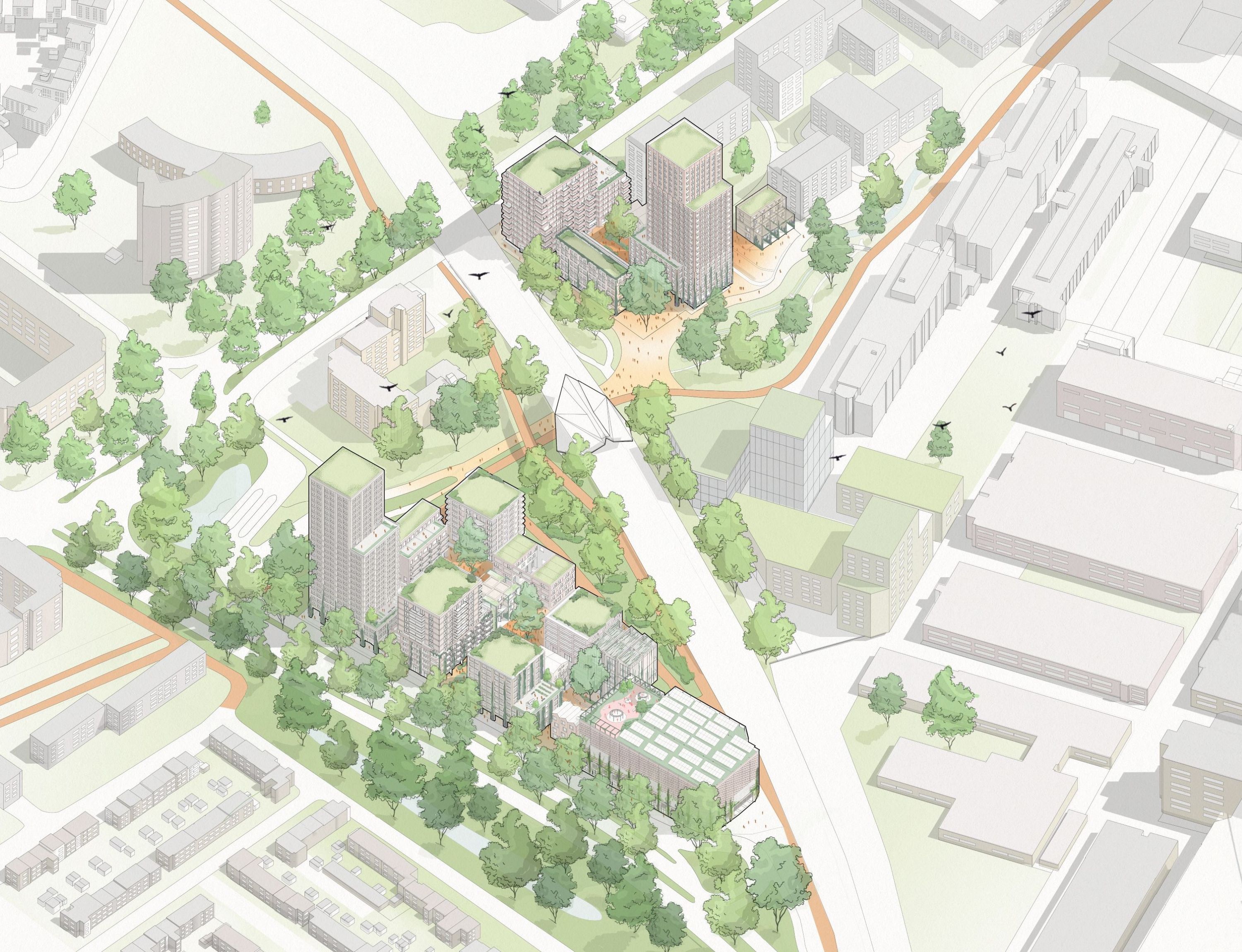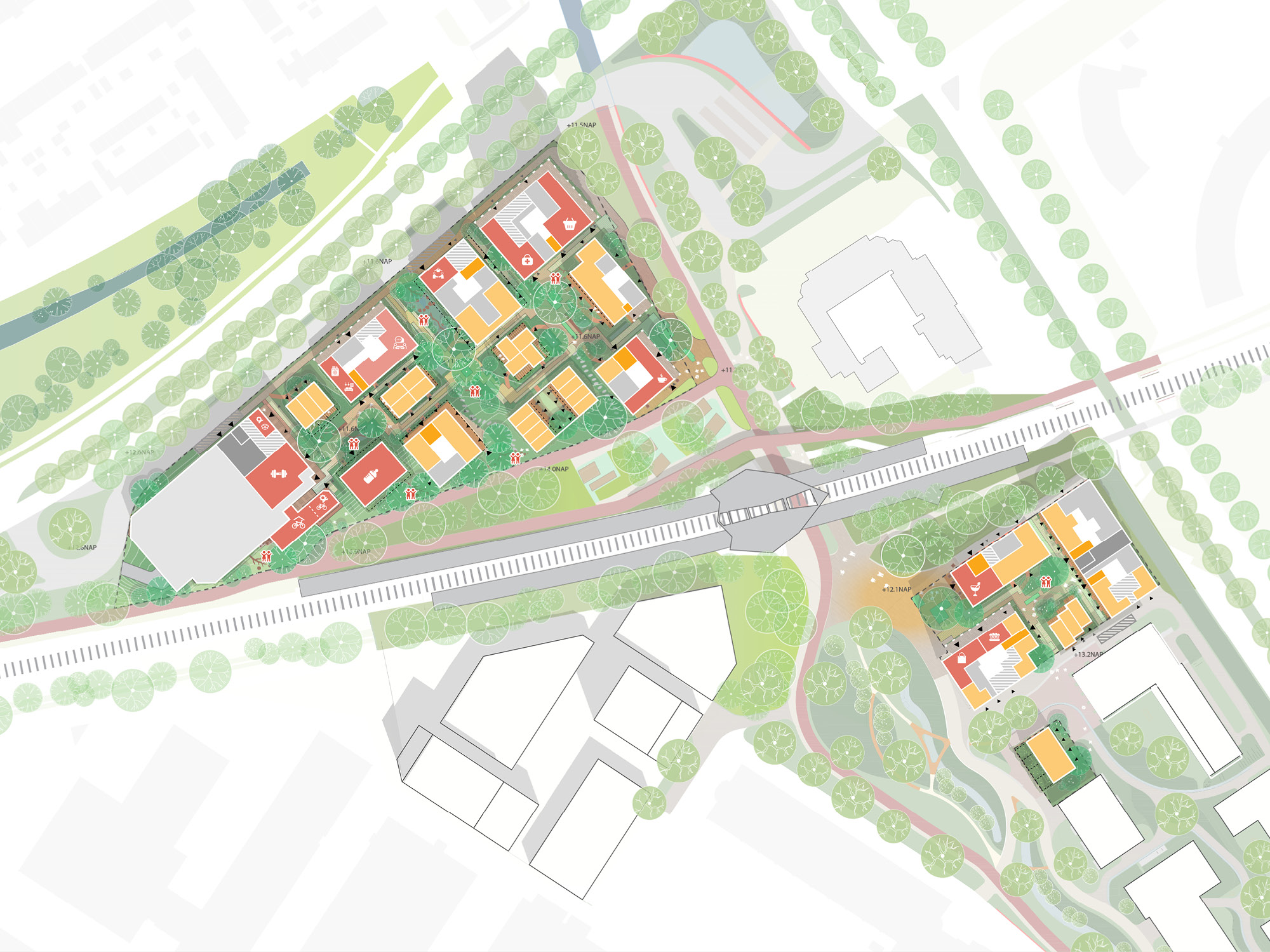 In the Goffert station area, the landscape takes the lead. The winning proposal for this urban redevelopment starts out with a structure of green spaces, alleys, and public courtyards. This framework organises the playful placement of a diverse range of building typologies and program, ensuring they contribute to a sense of enclosure and liveliness and providing a dense network of pedestrian and ecological pathways.