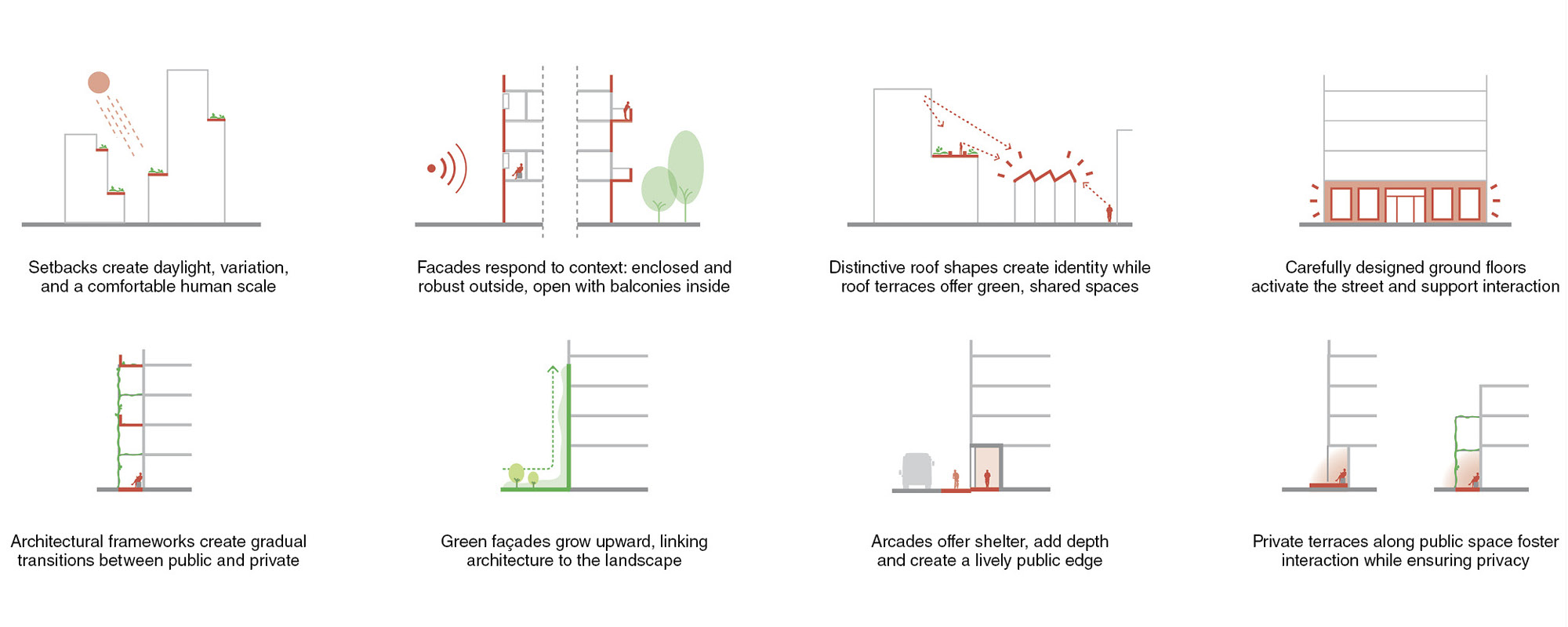 The quality of the station area lies in the sum of its parts. The robust buildings together form a playful ensemble, with architecture emphasizing typology and individual identity. The tall towers are given a clear base, hard edges are softened with arcades, and the smaller volumes are given distinctive forms. In all of this, the proportions and design of the buildings are carefully attuned to the human experience and scale.