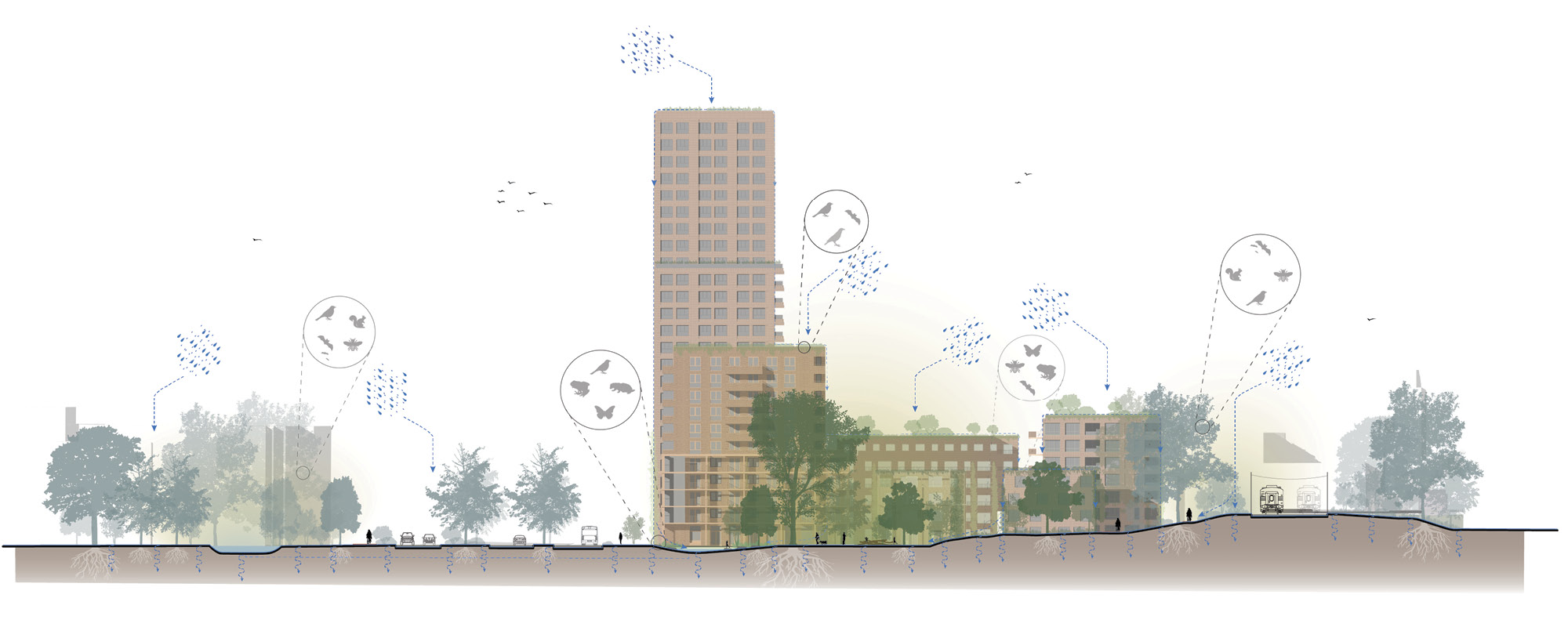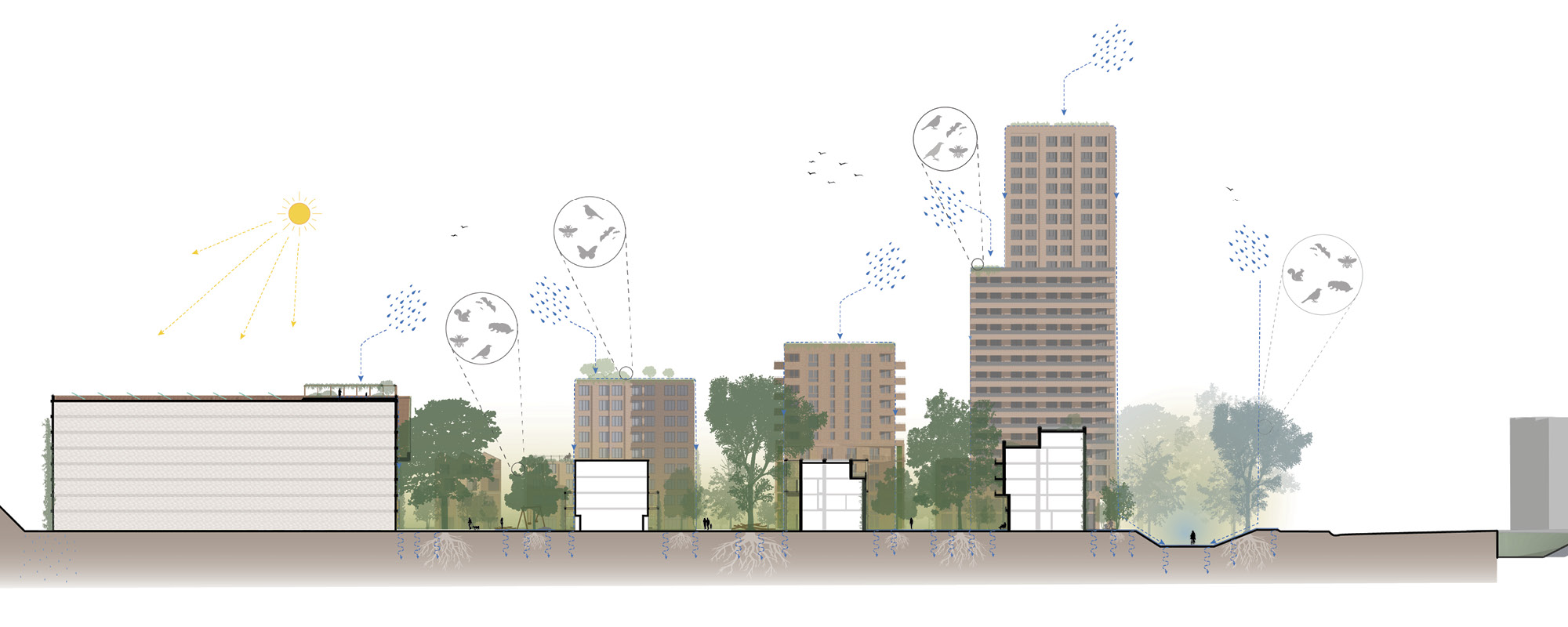 By putting the landscape first, Goffert becomes an inviting place for all users, including birds and other animals. The buildings are firmly rooted in the landscape by integrating climbing plants into the façades and nesting opportunities at various heights and orientations. A smart water management system ensures rainwater is collected, stored and slowly dispersed into the soil. Large trees provide shade and cooling on hot summer days.