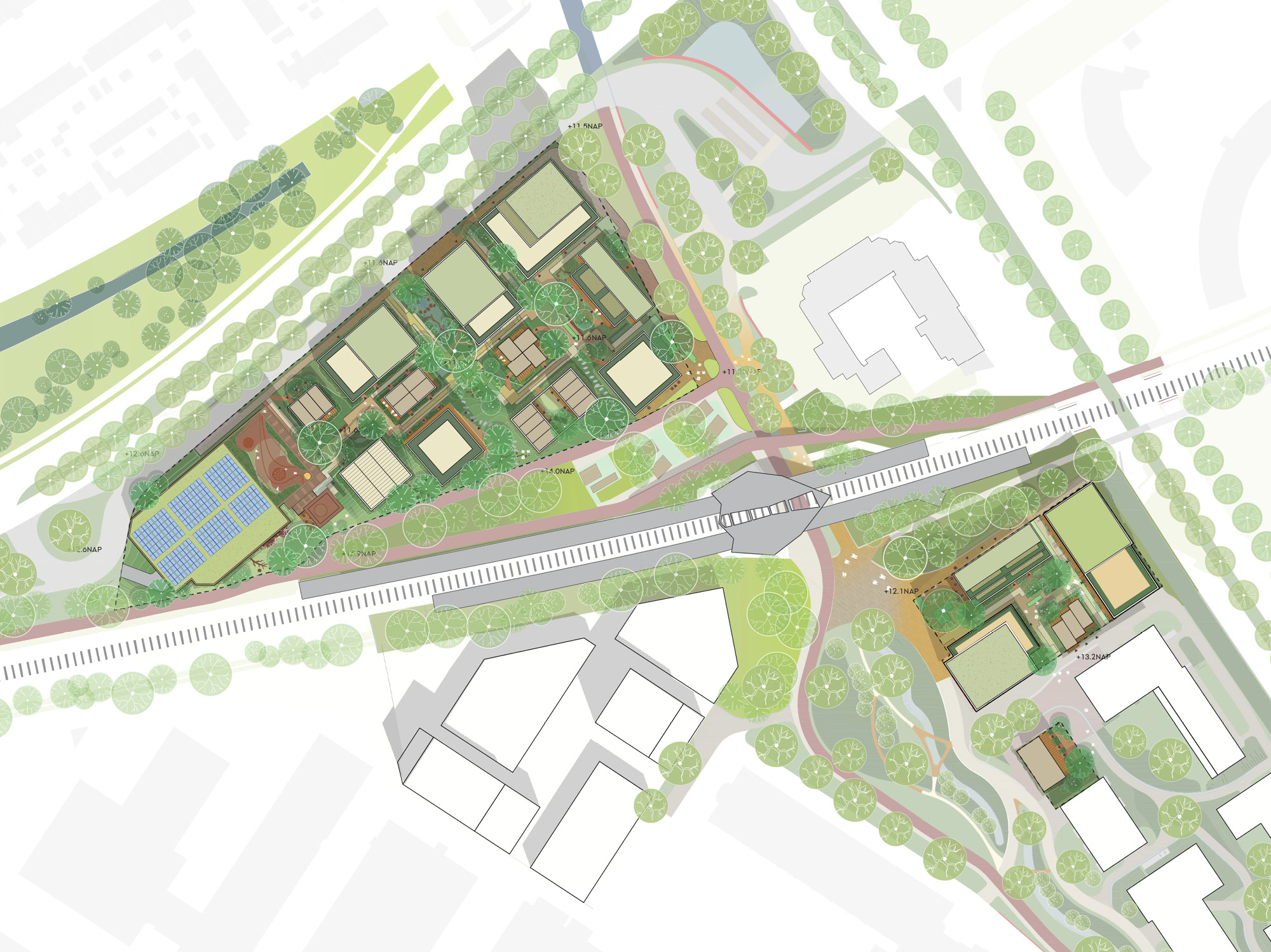 The result is a layered form of urbanism that balances high density and urbanity with a human-scaled, intimate feeling, creating a healthy living environment for both people and nature.