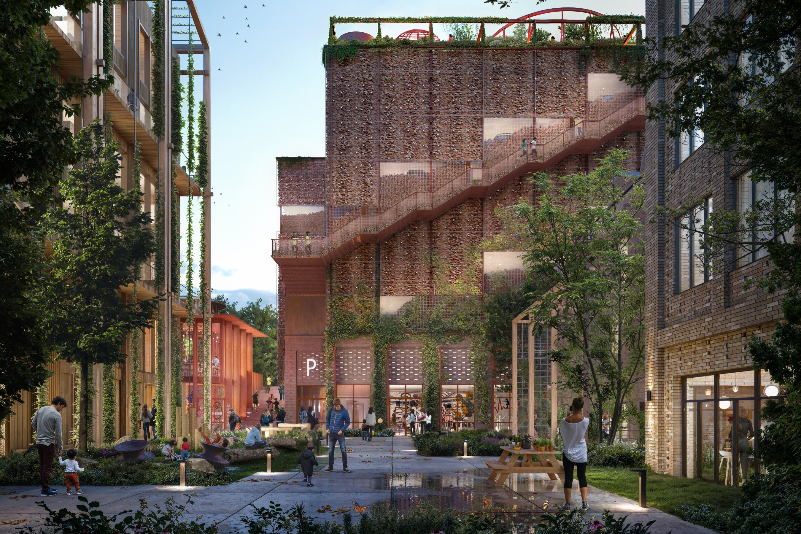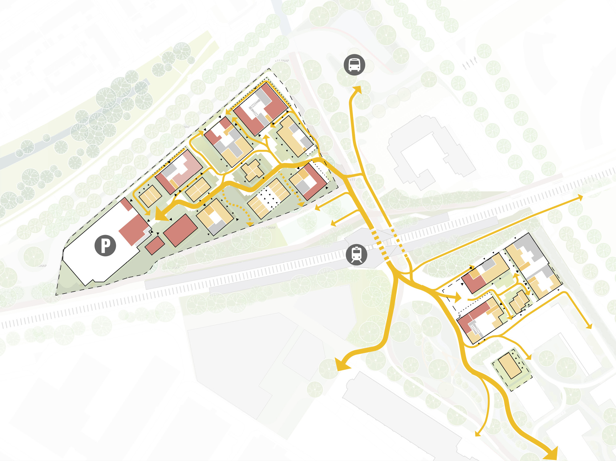 Within the neighbourhood, programmatic anchors initiate pedestrian movement and activate the area. These anchors stimulate interaction, strengthen community ties, and contribute to social cohesion. One special anchor is the mobility hub. More than a parking facility, it includes a gym, repair services, and a rooftop sports court – bringing activity and daily life into the neighbourhood.